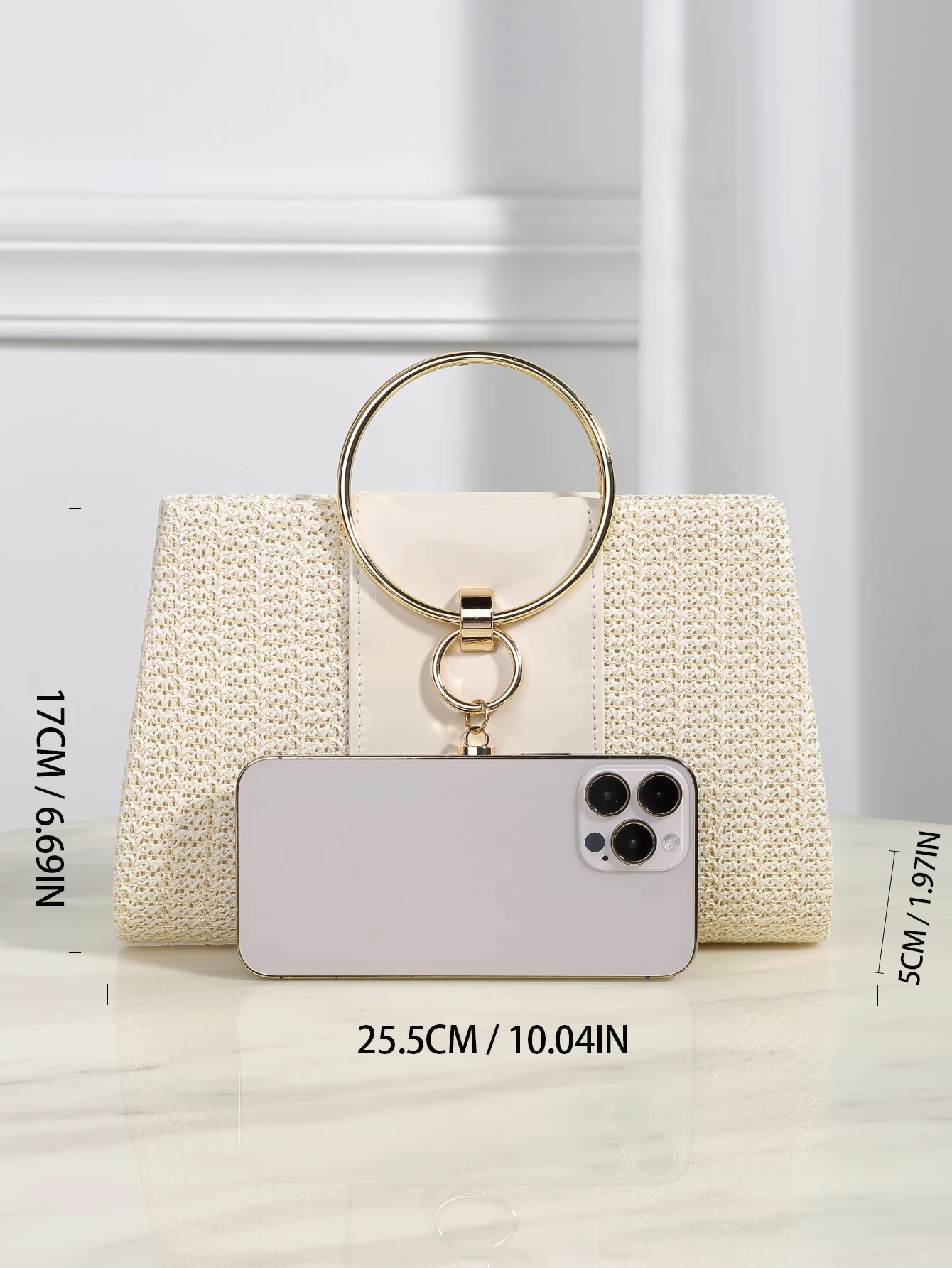Craquez pour notre Sac À Main Élégant En Paille Tressée Blanc Avec Anse Dorée Et Pampille – Parfait Pour L’été
