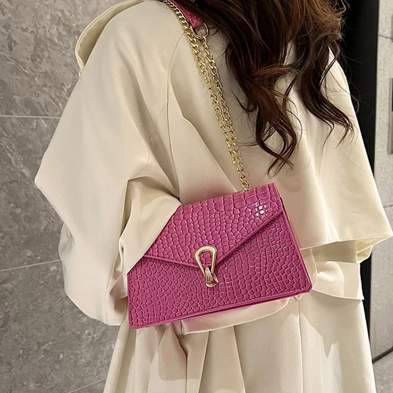 Le meilleur de Sac À Main En Cuir Rose Effet Croco – Chaîne Dorée Et Fermoir Original