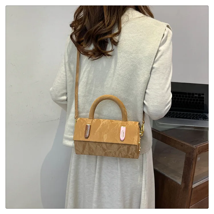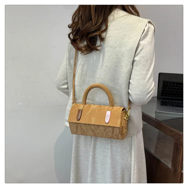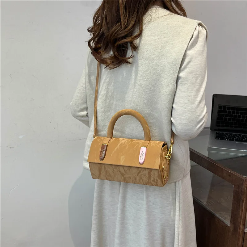 Découvrez le bag à main chic en daim marron clair, un accessoire incontournable qui rehausse instantanément toute tenue. Son design cylindrique, agrémenté de détails dorés, lui confère une élégance raffinée, parfaite pour les fashionistas en quête de style. Ce sac se distingue par ses attraits uniques qui le rendent à la fois sophistiqué et moderne.