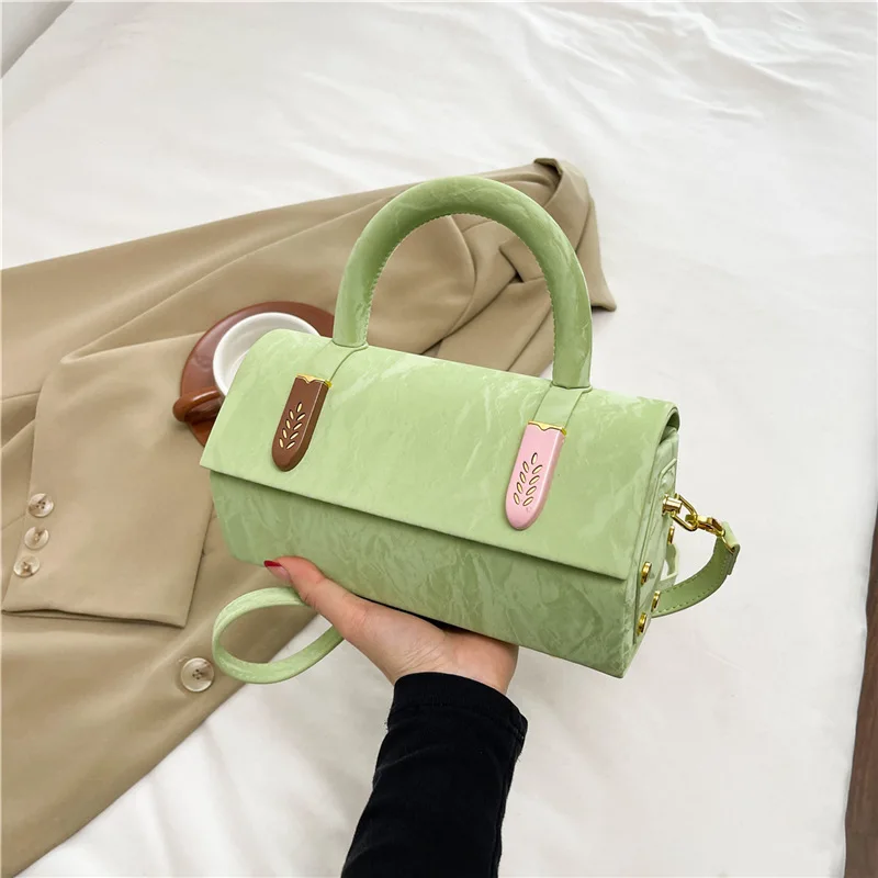 Découvrez le Sac À Main En Daim Vert Cylindrique – Chic Avec Détails Dorés de Sac à main en cuir, l’accessoire idéal pour affirmer votre style avec élégance et originalité, parfait pour toutes vos sorties !.