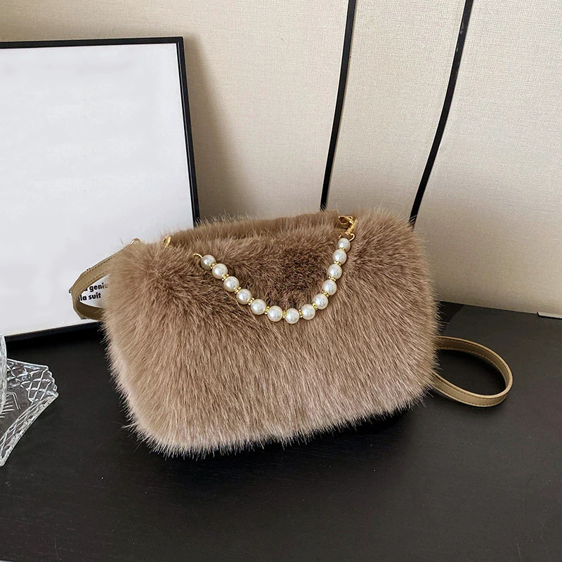 Sac À Main En Fausse Fourrure Marron Avec Chaîne De Perles – Élégant Et Chic