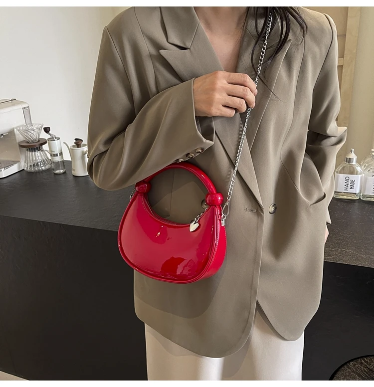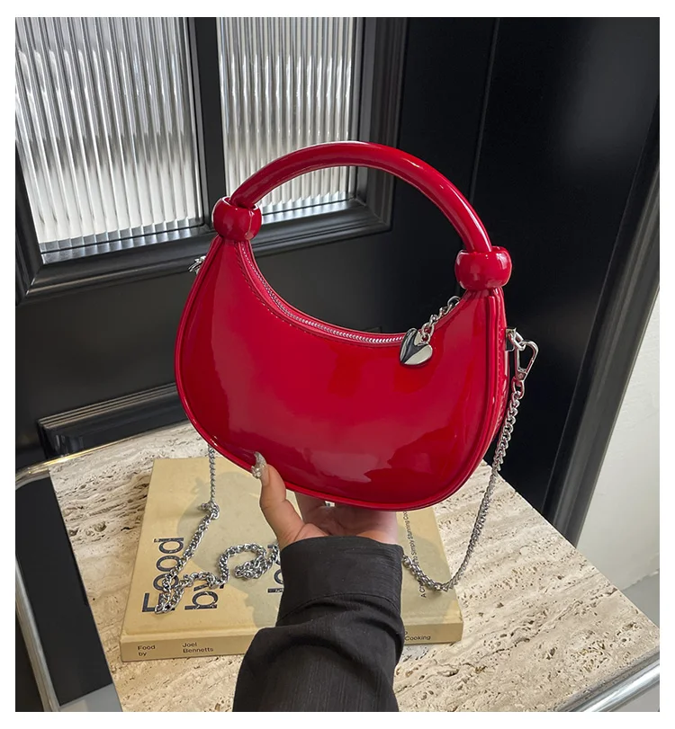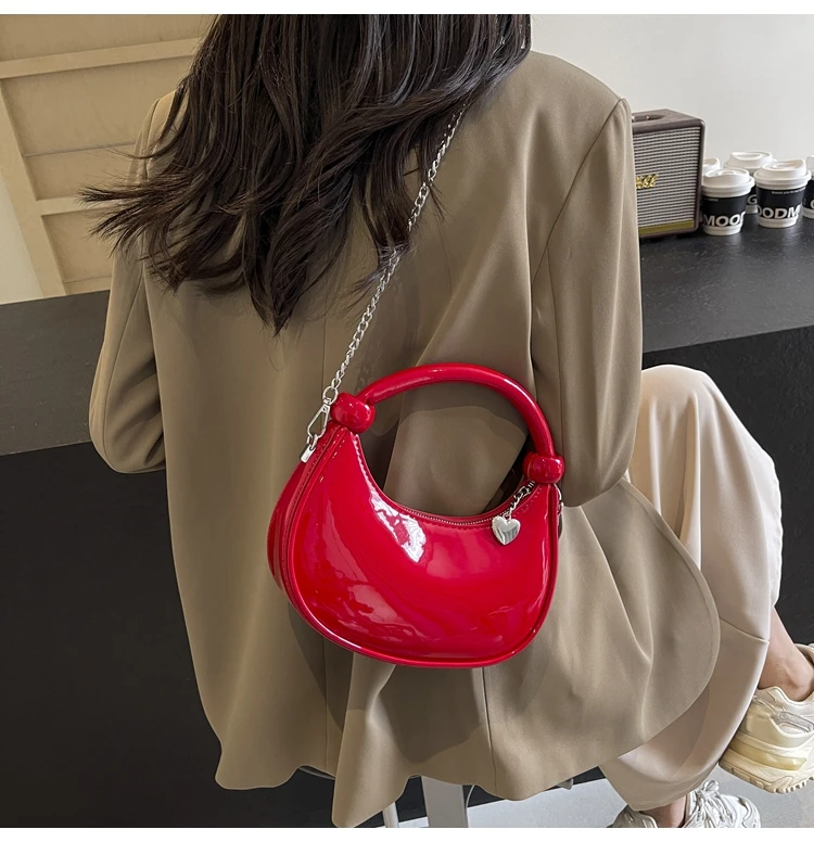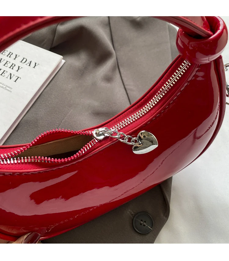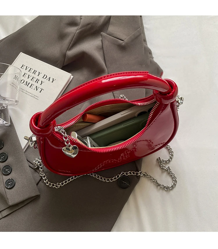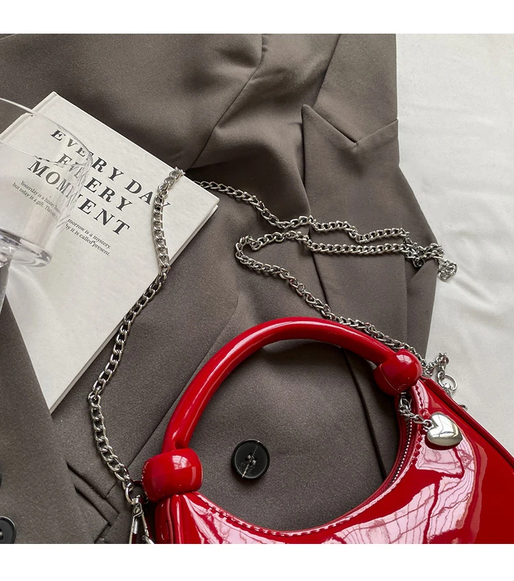Laissez-vous tenter par Sac À Main Verni Rouge – Design Moderne Avec Anse Arrondie Et Pendentif Cœur